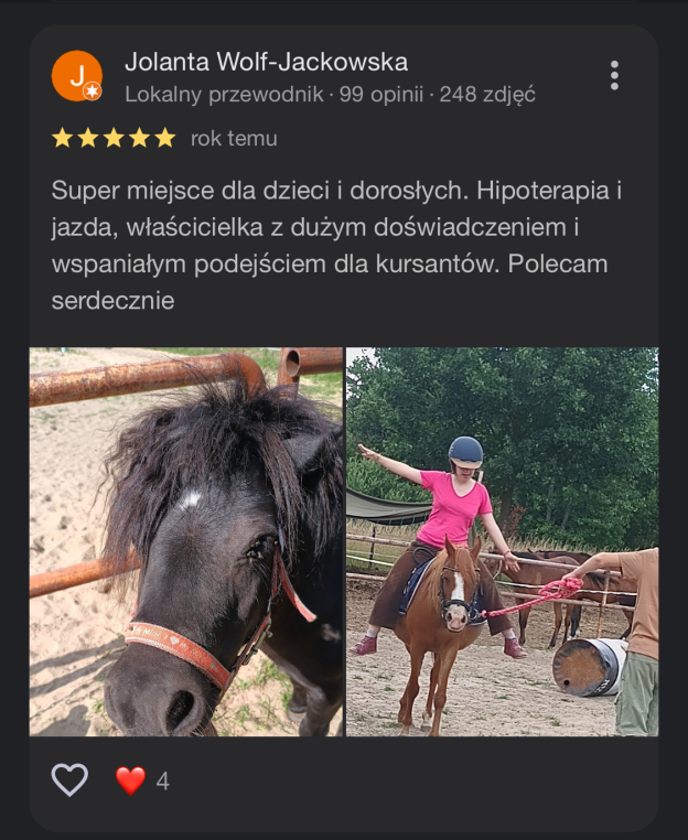 W nauce jazdy konnej kładziemy nacisk na indywidualne podejscie , pracę w małych grupach w dobrej atmosferze. Dzielimy się pasją do koni i jeździectwa. Trenujemy w zgodzie z końską naturą. Staramy się dbać o każdy najmniejszy szczegół abyś mógł poczuć się u nas sielsko . Naszym celem jest nie tylko rozwijanie umiejętności technicznych , ale także budowanie głębokiej więzi z koniem , której podstawą jest wzajemne zaufanie i szacunek.